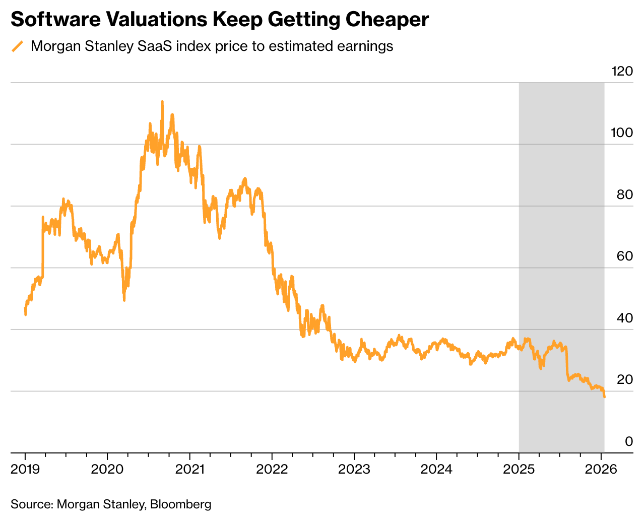 Despite the grim start, the carnage has pushed software valuations to record lows, with the sector trading at just 18 times forward earnings, a fraction of its 55x decade-long average.